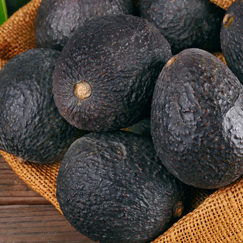 Lamb Hass avocadoes are larger than the common hass variety, weighing anywhere from 10-18 ounces. They grow on productive, upright, compact trees, maturing later in the season than their hass relative. They have a pear or oval shape, distinguished from hass avocados by their flat, squared shoulders. The pebbly skin is very dark green, even when under-ripe, and it will continue to darken to almost black as it matures. The skin of Lamb Hass avocados can be easily peeled to reveal the pale green flesh, which houses a medium-sized seed. Like hass avocadoes, the flesh of the Lamb Hass is smooth and creamy, and offers a similar rich and nutty flavor.